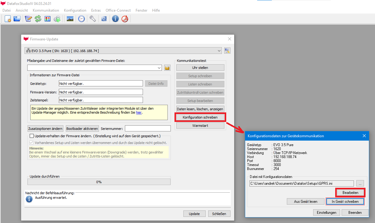 + Port/Firewall beachten! ACHTUNG IM GERÄT PORT OHNE FÜHRENDE 0!? - Gerätekonfiguration mit DataFox Studio laden (S\Prodat2005\DataFoxTerminal\config_2.8.aes geht auch für 3.5)