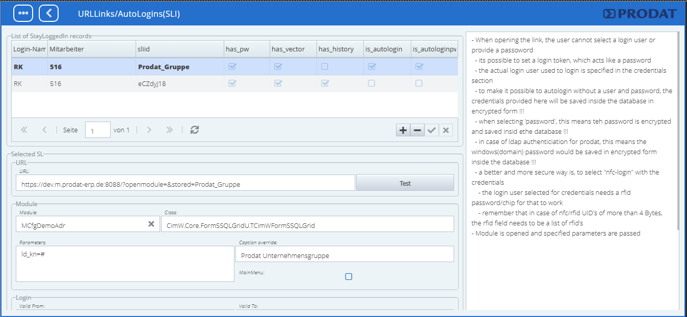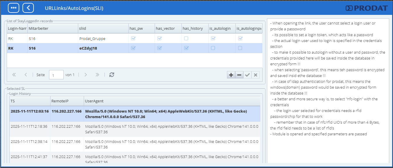 - Das Admin-Module "URLLink/SLI" erlaubt Zugriff auf die existenten SLI Einträge und die zugehörige Login-Historie